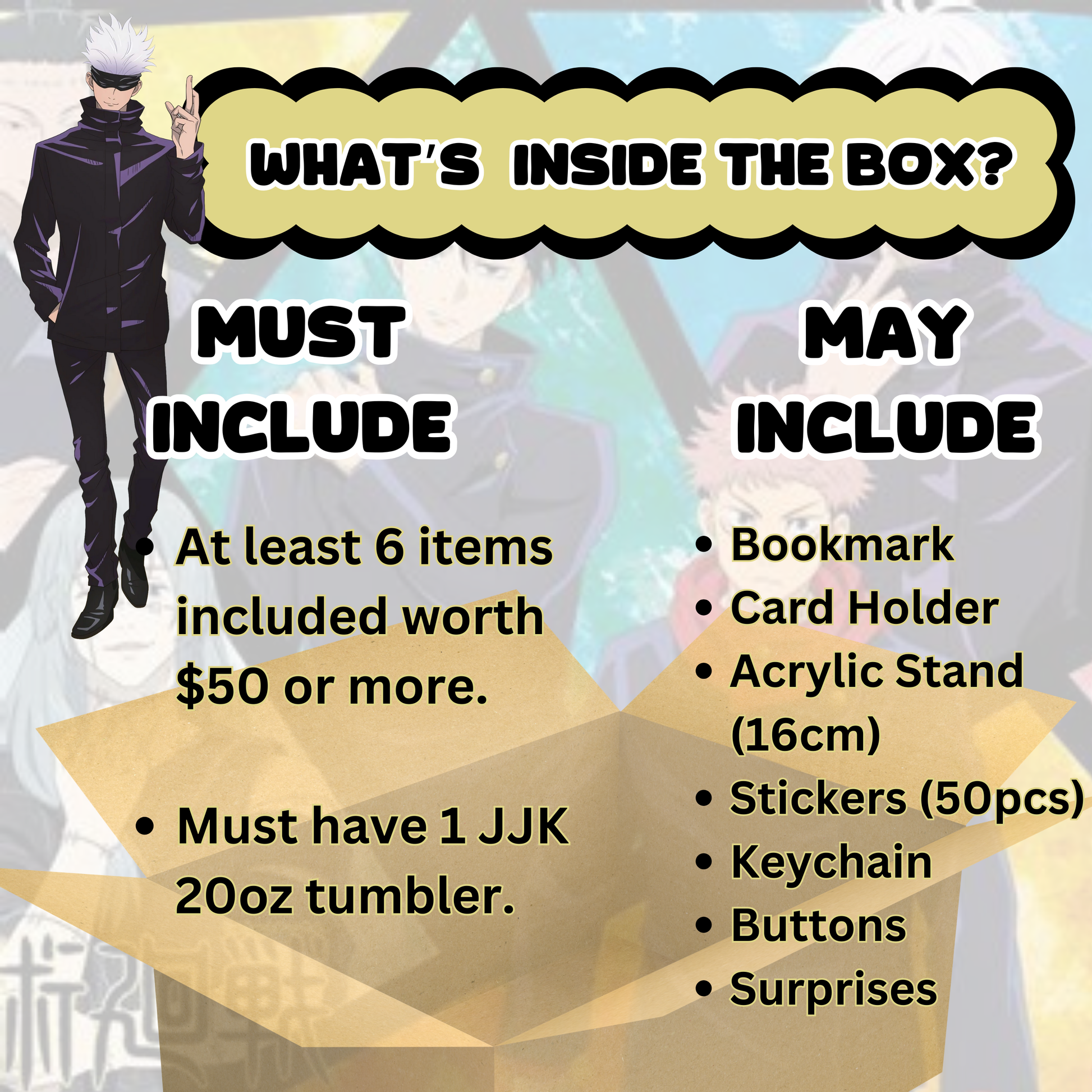 All items in this Jujutsu Kaisen Mystery Box is selected at random however we will ensure that the value of the items present in the box will never be less than those shown in the Descriptions.