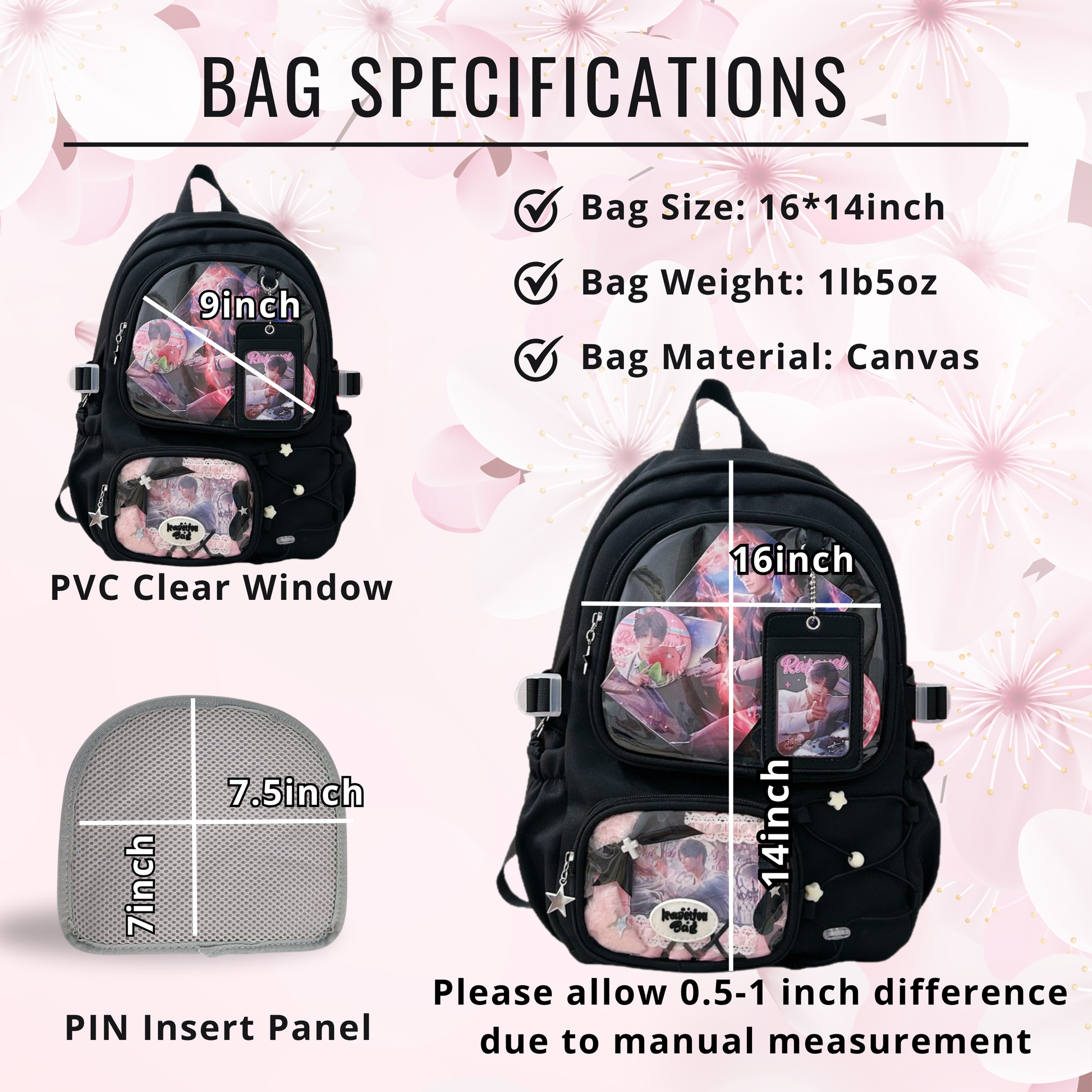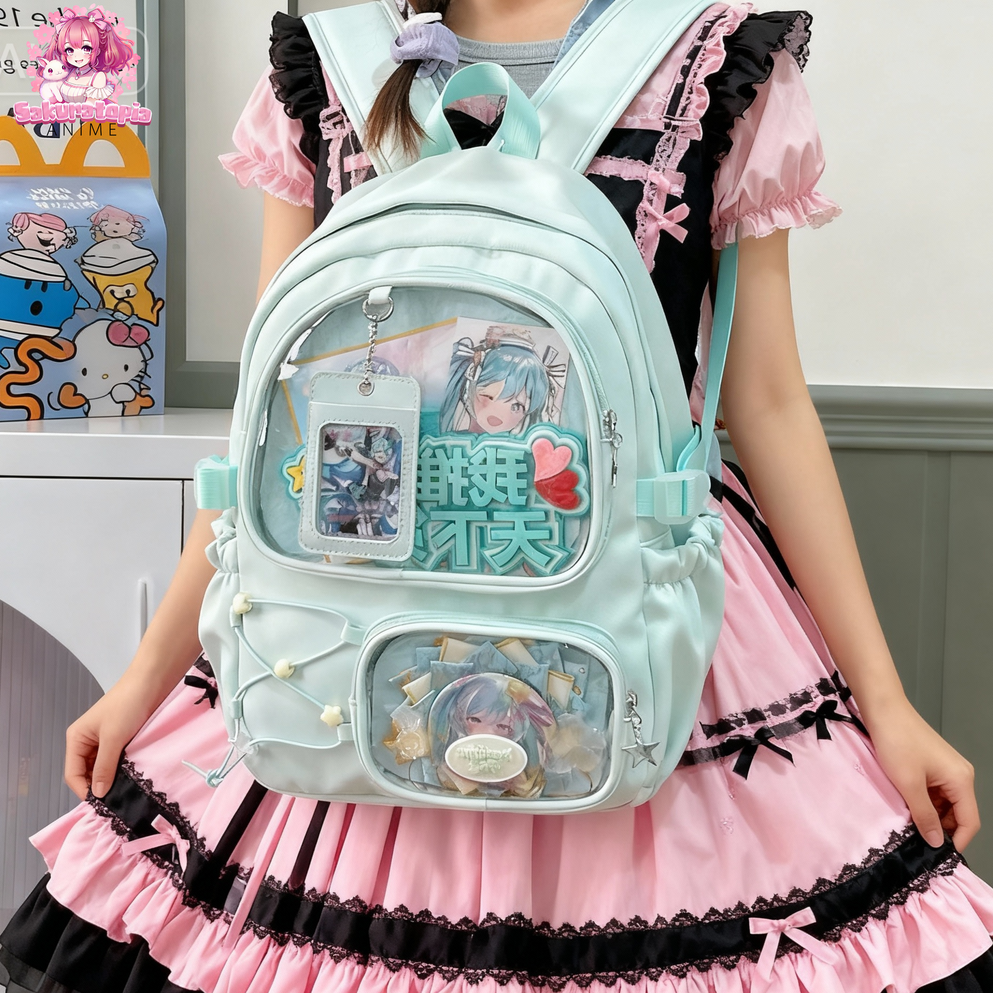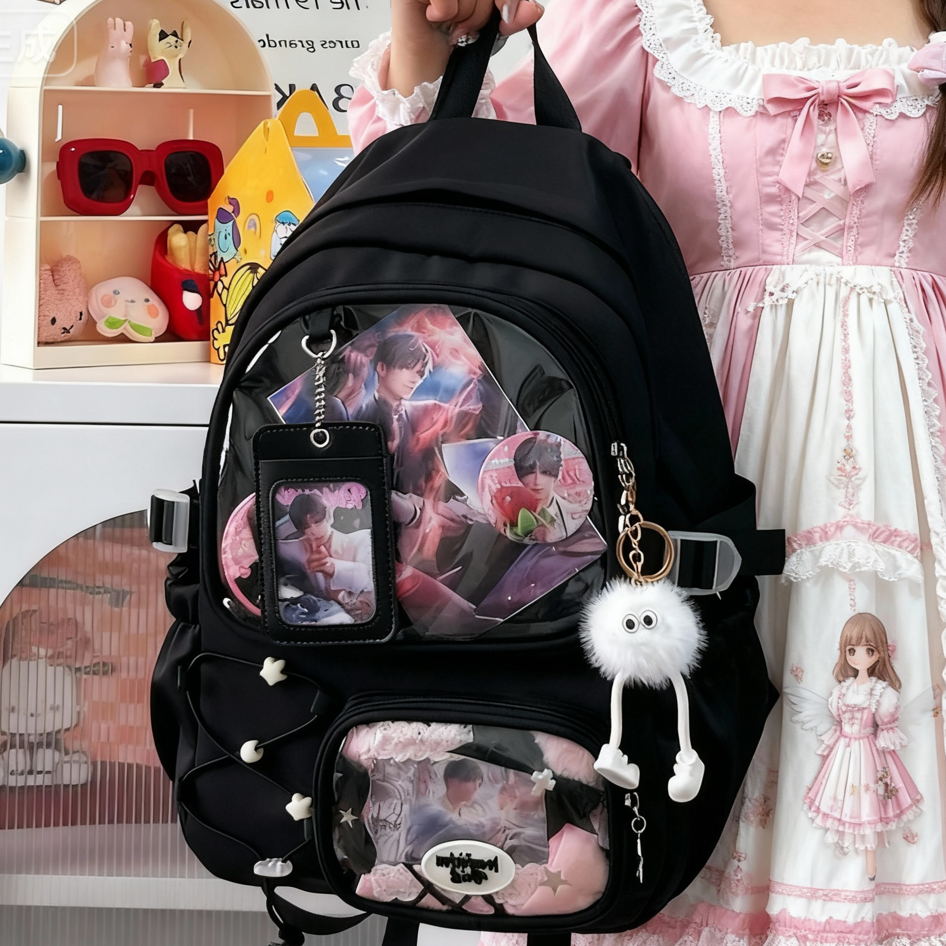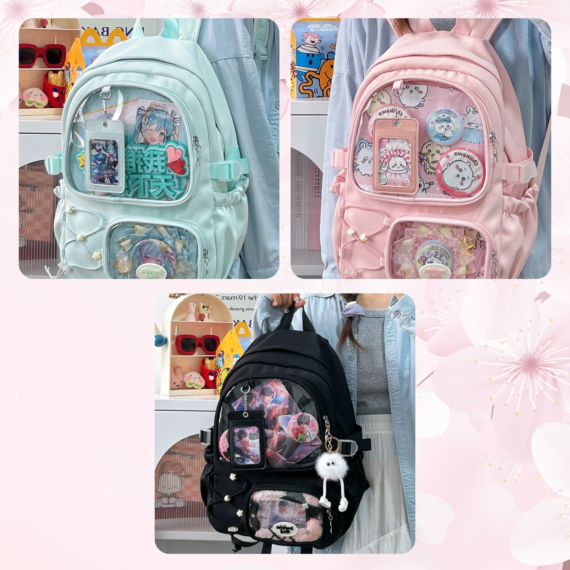 Take your pins, charms, and collectibles everywhere with this adorable Ita Backpack! Featuring 2 clear display pocket with a cute card holder which can show off your favorite picture. this backpack is perfect for anime fans, pin collectors, and lovers of kawaii style. Its large size makes it practical for school, conventions, or everyday use while letting you show off your favorite merch safely.