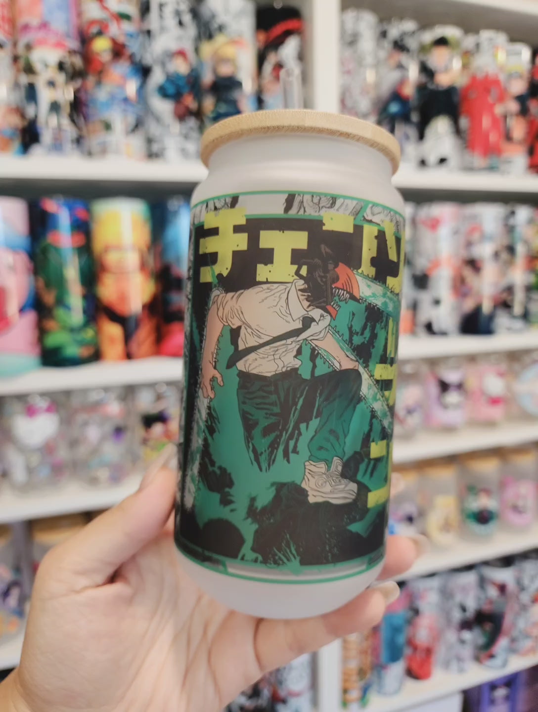 Chainsaw Man Anime Matte/ Frosted Glass cup 16oz Beer Can Glass with Straw and Lid