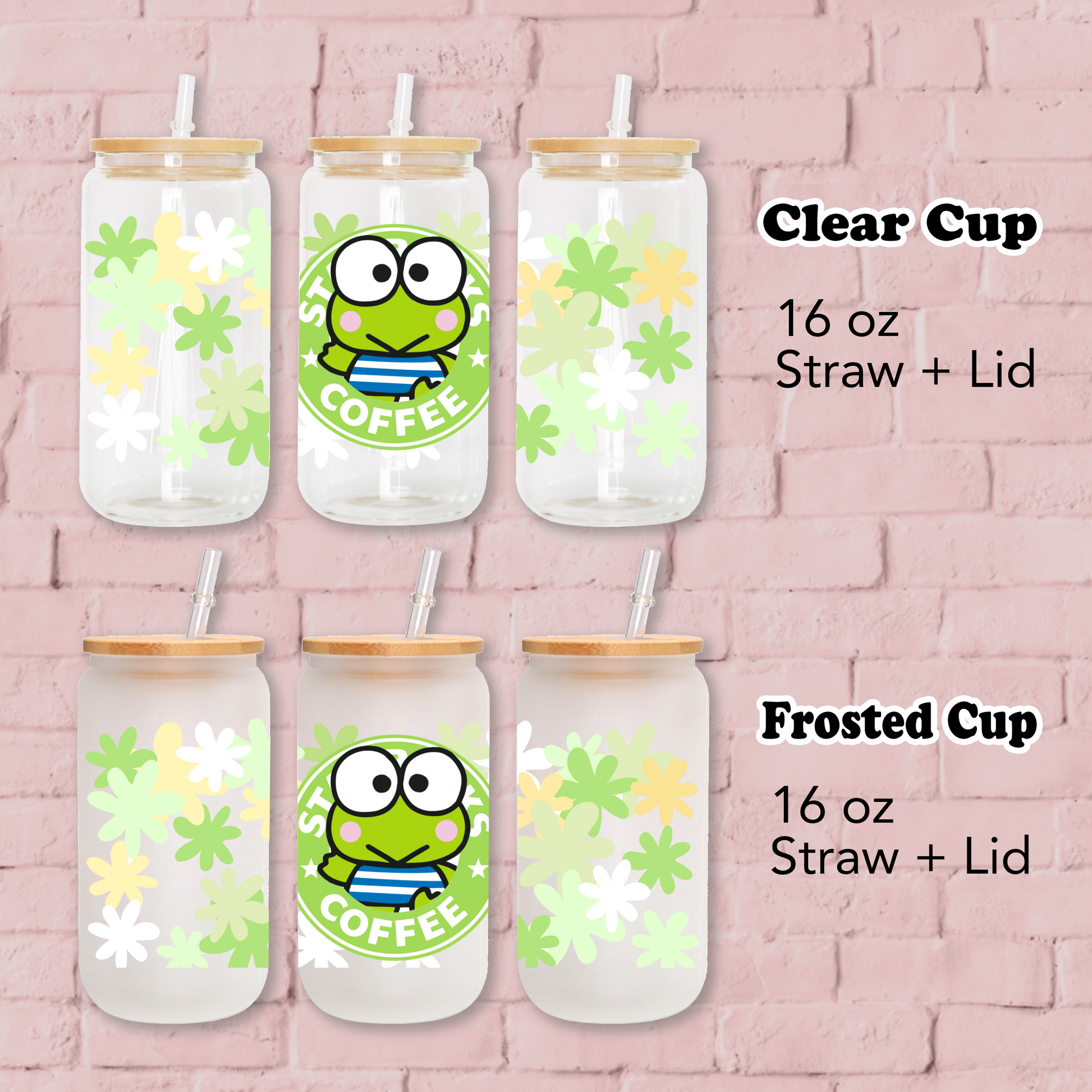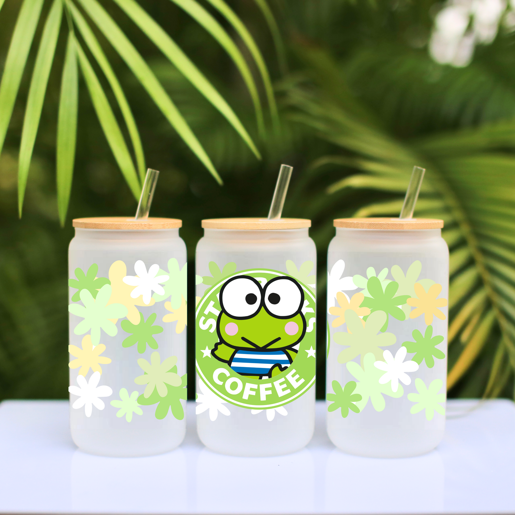 Keroppi with Flowers Anime 16oz Beer Can Glass with Straw and Lid