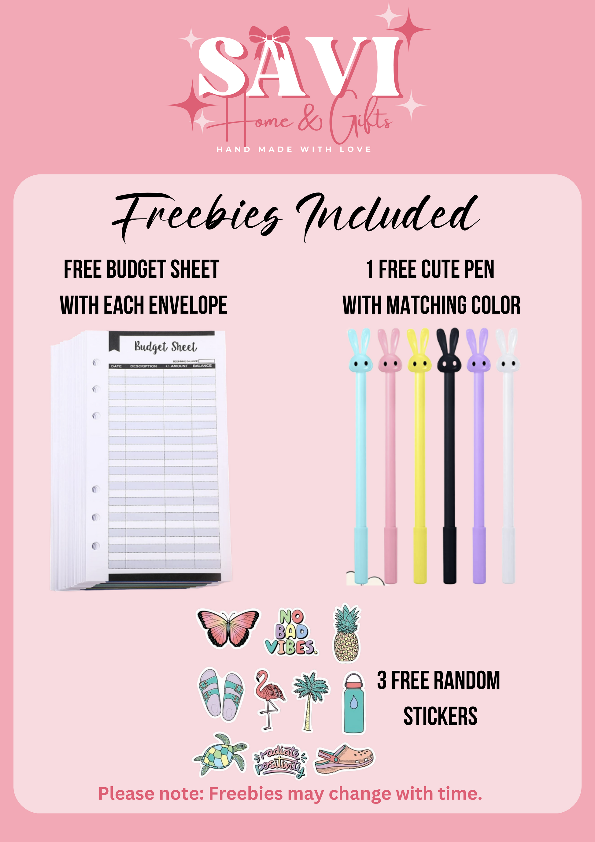 -Freebies: 3 random free stickers, 1 cute pen, and a budget sheet for each cash envelope.