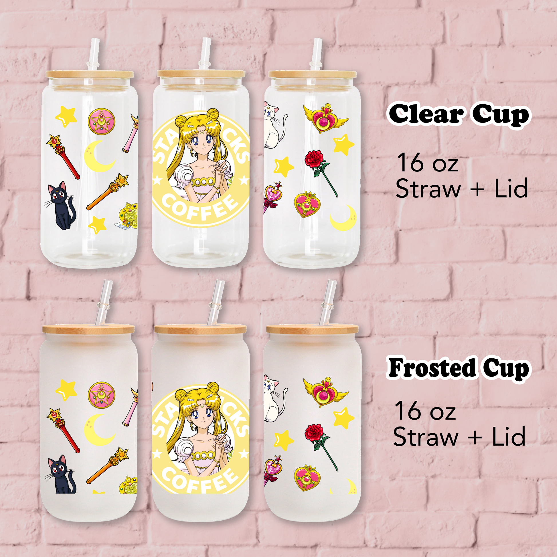 Sailor Moon Yellow Starbucks Anime 16oz Beer Can Glass with Straw and Lid