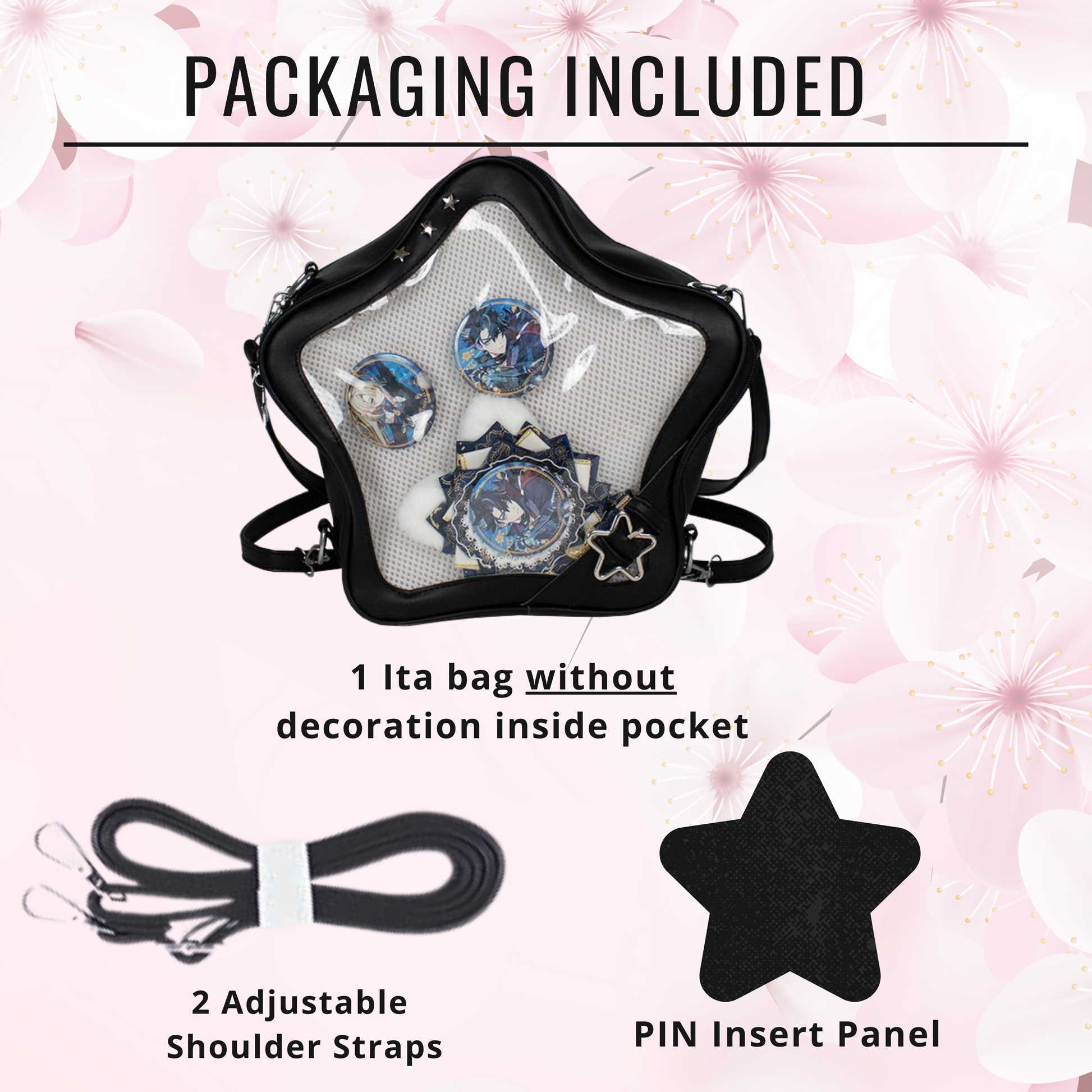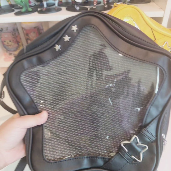 Shine bright with this Yellow Star Ita Backpack! This ita bag doubles as both a crossbody bag and a backpack thanks to its adjustable straps. Designed in a bold star shape, this ita bag is the perfect accessory for anime fans, pin collectors, and lovers of kawaii fashion. The clear front window lets you safely display your favorite enamel pins, charms, and keychains while adding a magical touch to your outfit.