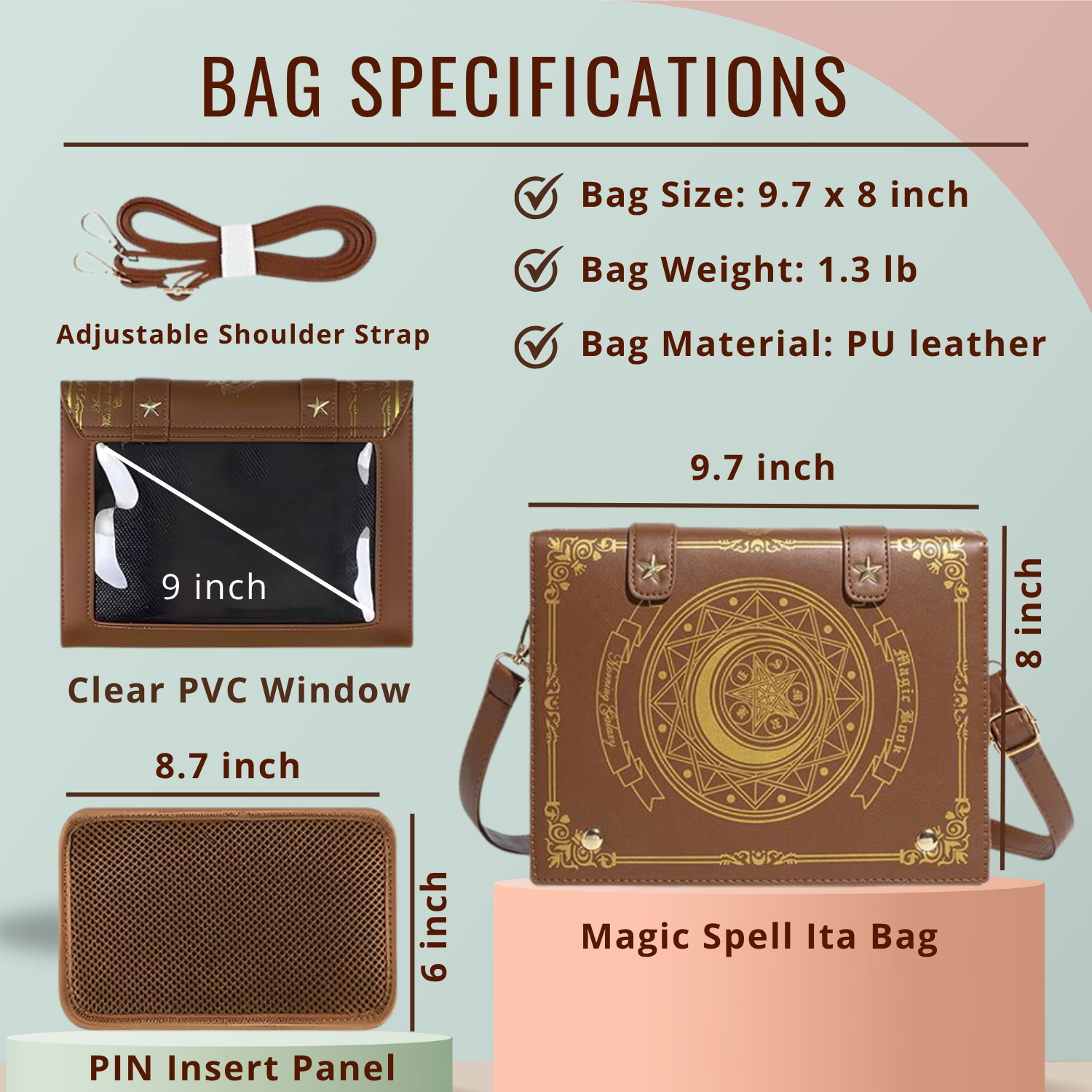 Spell book ita bag, anime ita bag, kawaii display bag, enamel pin ita bag, witchy ita bag, fantasy cosplay bag, kawaii ita crossbody