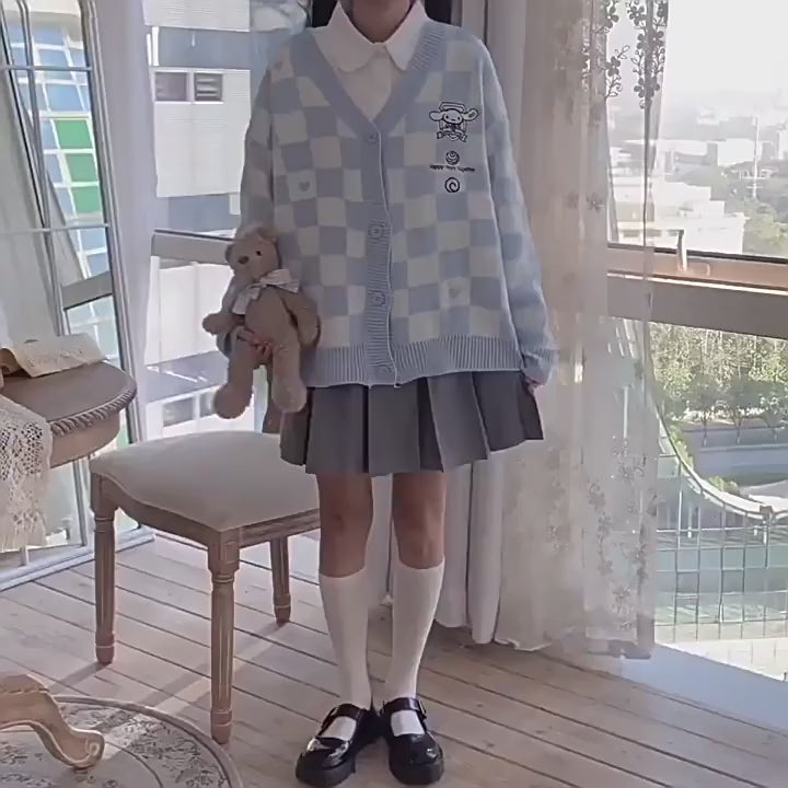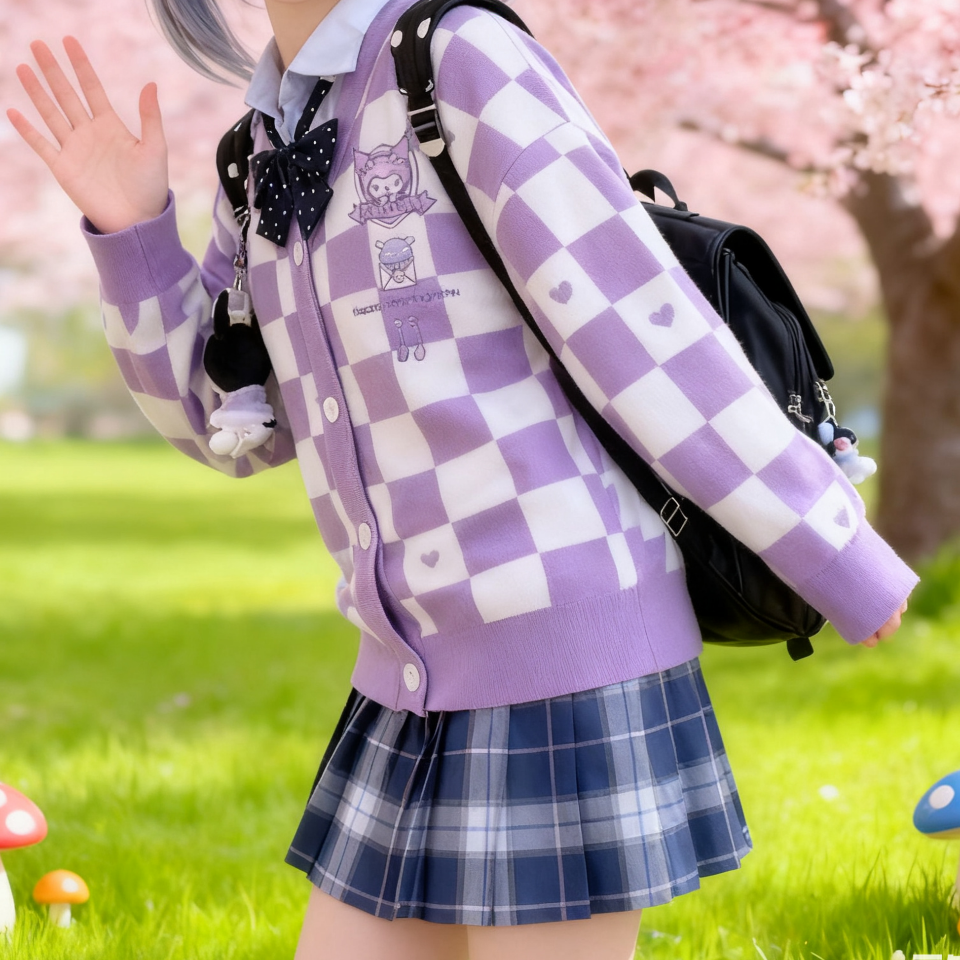 One Sized/Unisize Sanrio Checkered Cardigan, Cute Sweater Cardigan Cartoon, Embroidery Checkerboard Heart sweater, Student Uniform style