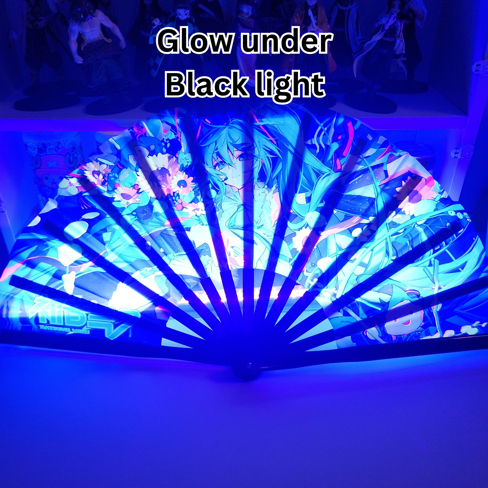 Under black light or UV light, the fan glows brightly, adding a stunning visual effect during nightclubs, festivals, and anime parties.
