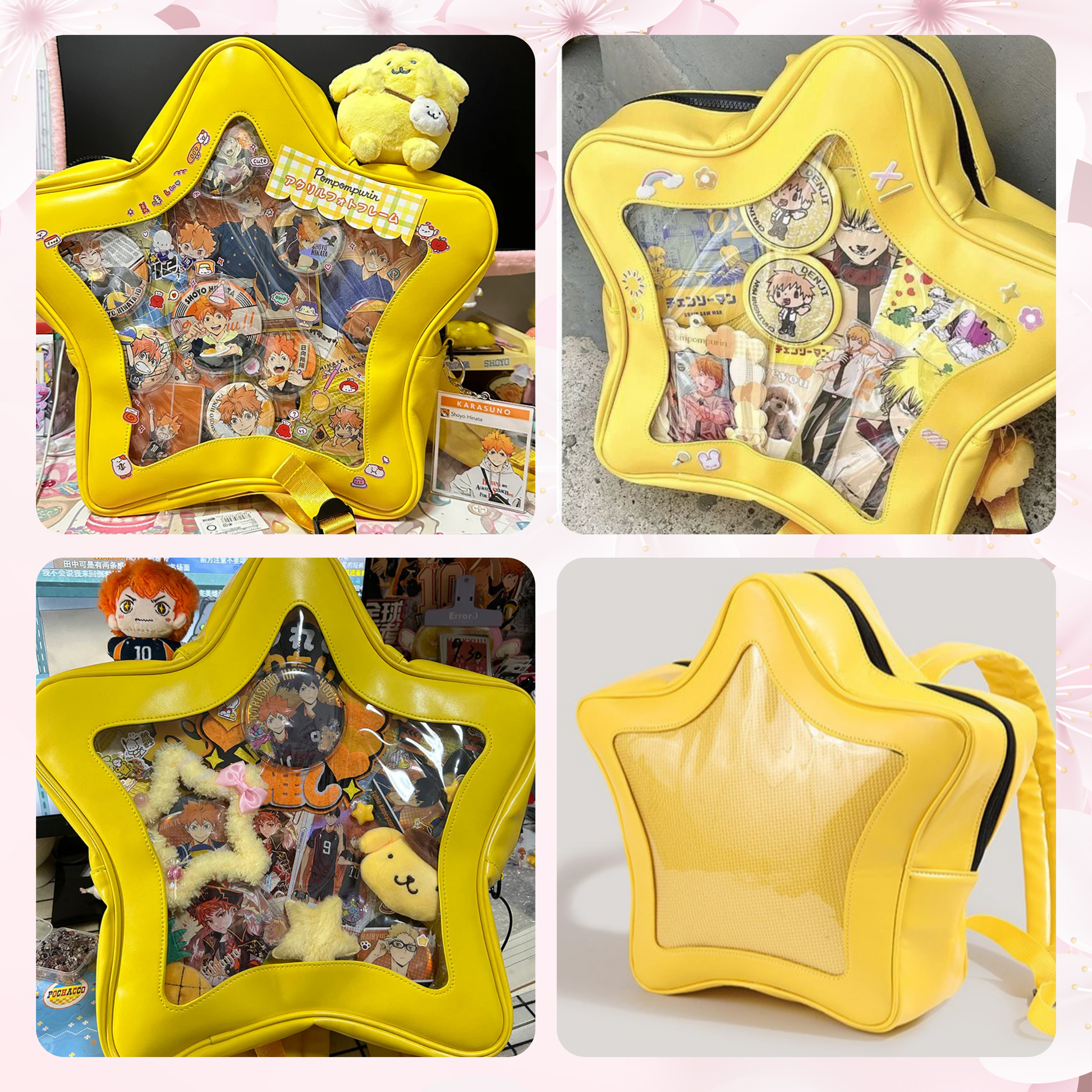 Shine bright with this Large Yellow Star Ita Backpack! Designed in a bold star shape, this ita bag is the perfect accessory for anime fans, pin collectors, and lovers of kawaii fashion. The clear front window lets you safely display your favorite enamel pins, charms, and keychains while adding a magical touch to your outfit.